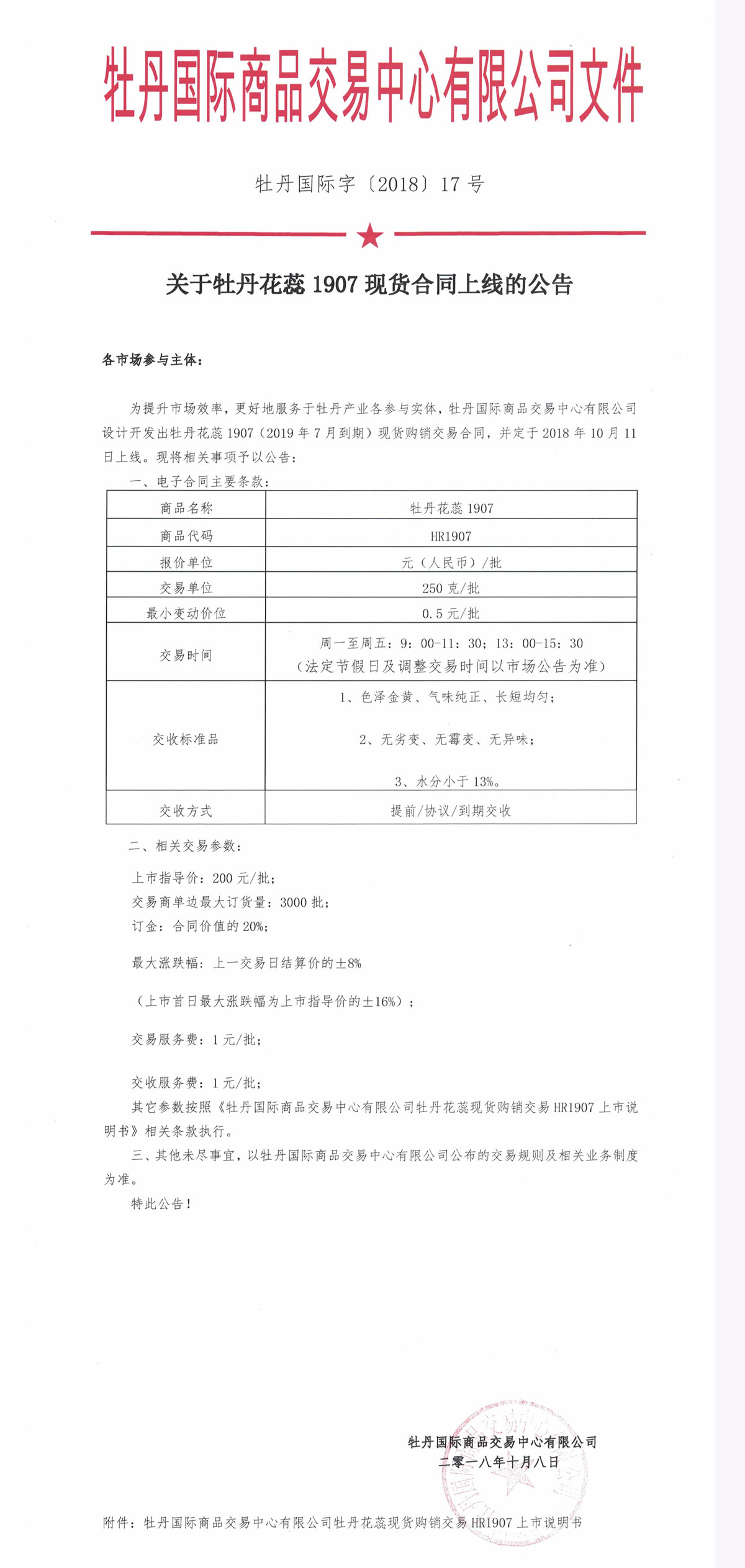 關(guān)于牡丹花蕊1907現(xiàn)貨合同上線的公告
