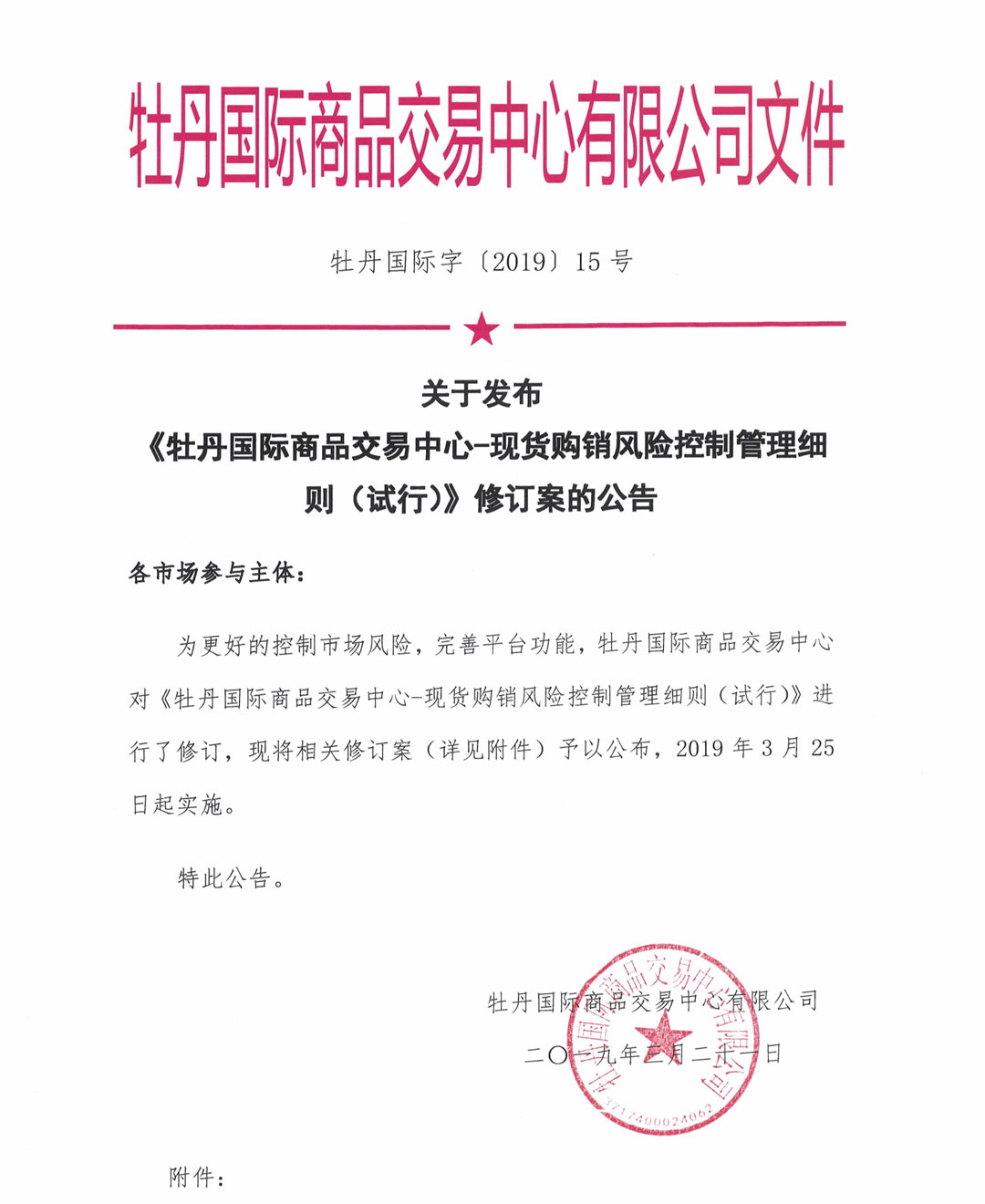 關(guān)于發(fā)布《牡丹國際商品交易中心現(xiàn)貨購銷風險控制管理細則(試行)》修訂案的公告