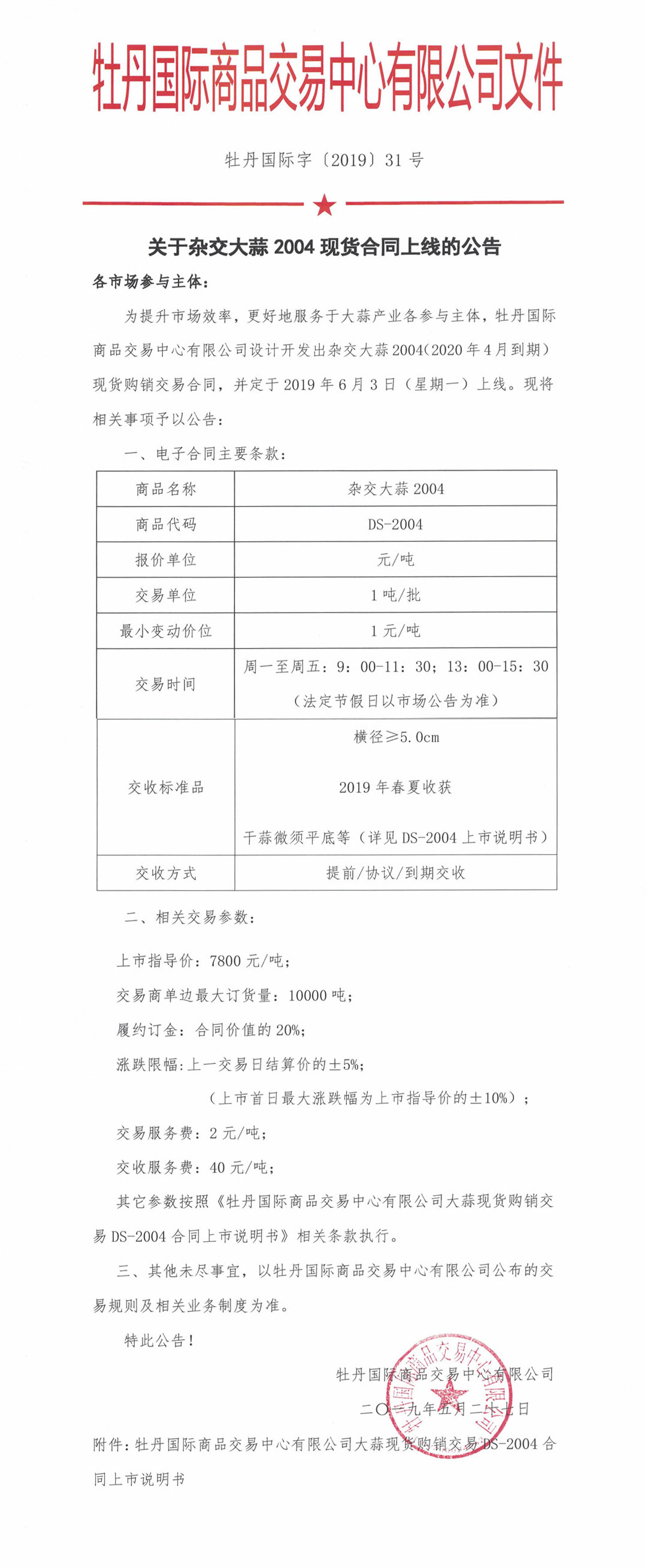 關(guān)于雜交大蒜2004現(xiàn)貨合同上線的公告